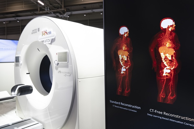 关怀至微:AI赋能从系统质控、图像采集、重建到病灶量化分析的全工作流,提升诊断精度和工作效率,解放科室人力。其搭载行业首款AI多核素迭代重建算法uExcel DPR 2.0,训练集来自2米Total-body PET/CT uEXPLORER和长轴金标准uMI PanoramaGS的千万幅级样本,一是带来3.9倍的信噪比提升,二是与常规采集协议同等图像质量下,实现低剂量2-3分钟的全身快速扫描,三是将Al重建的适用范围从常规FDG拓展至以PSMA、FAPI、Amyloid和SSTR为靶点的核药成像。