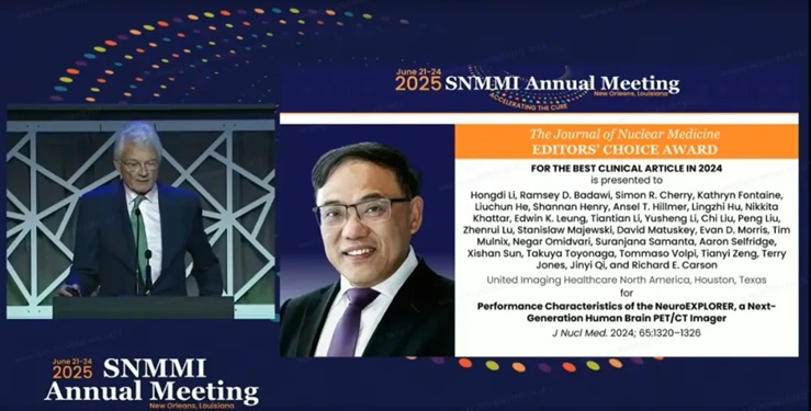 耶鲁大学、加州大学戴维斯分校及美国联影共同完成的NeuroEXPLORER(NX)脑PET在神经影像领域研究取得重大突破,其创新技术为神经系统疾病诊疗提供了全新解决方案。会上,《核医学杂志》(Journal of Nuclear Medicine, JNM)主编Dr. Johannes Czernin宣布,由联影医疗首席科学官李弘棣博士带领的NeuroEXPLORER团队共同完成的《新一代人脑PET/CT成像仪NeuroEXPLORER的性能特征》论文荣获编辑精选的2024年度"最佳临床论文"和"年度最佳论文"双项大奖。